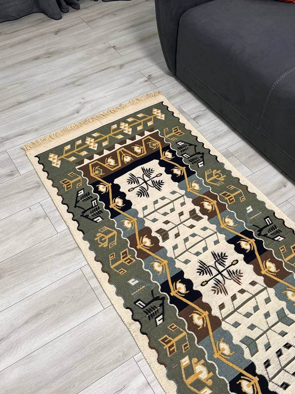 Килим виготовлений на фабриці в Туречинні, кожний узор - це окремий колір нитки. Складається з 100% бавовни, приємний на дотик, можна прати в машинці, чітко виглядає, як на фото.