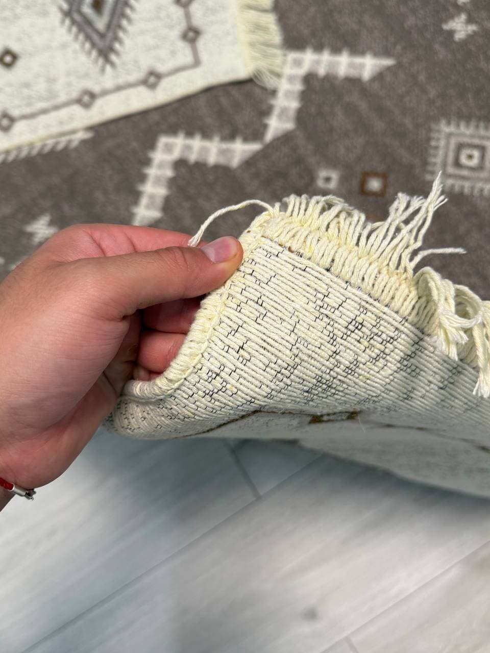 Килим виготовлений з бавовни та поліестеру. Приємний на дотик. Особливість килима полягає в тому, що він має прорезинену основу й відповідно не ковзає.