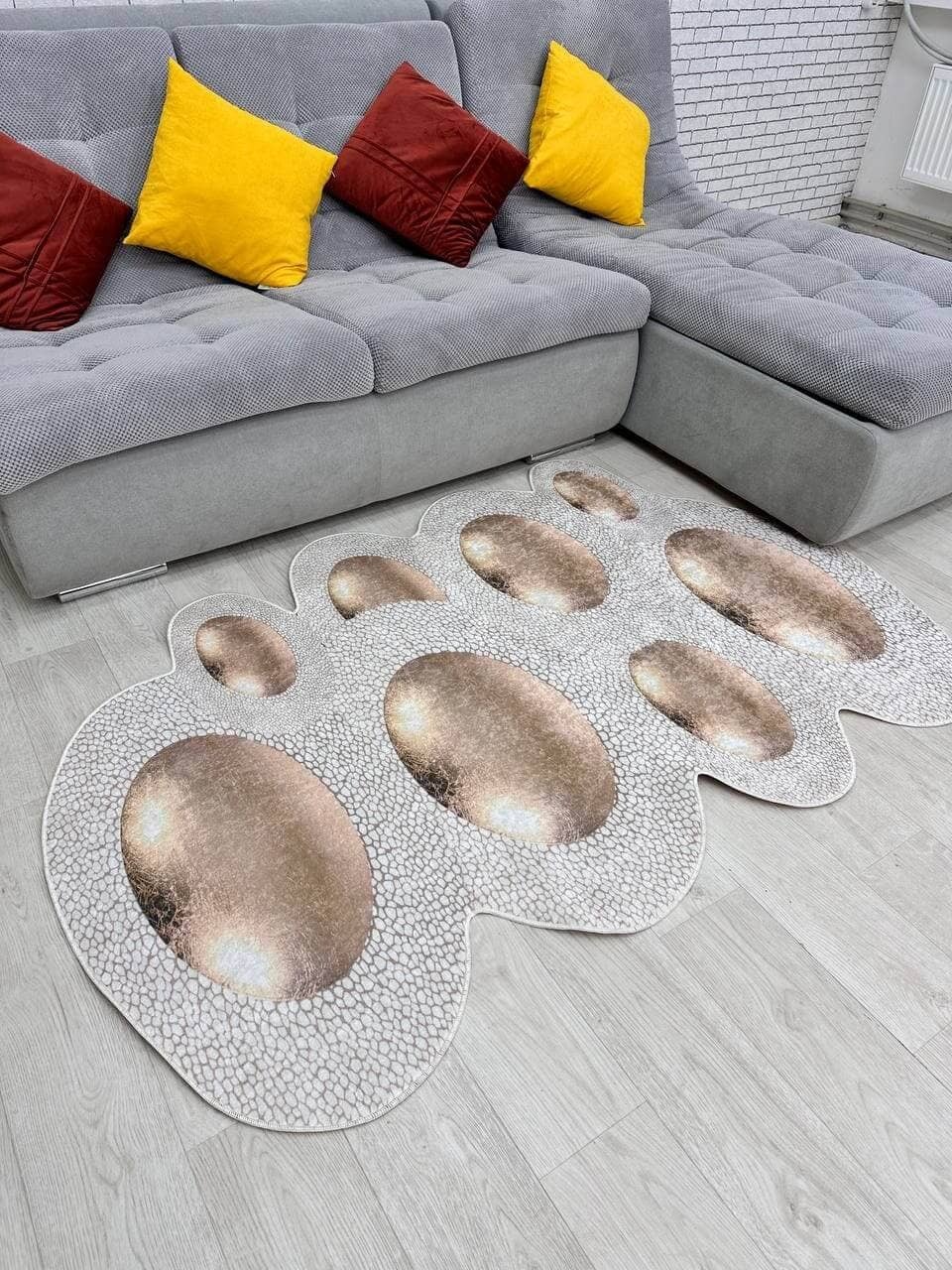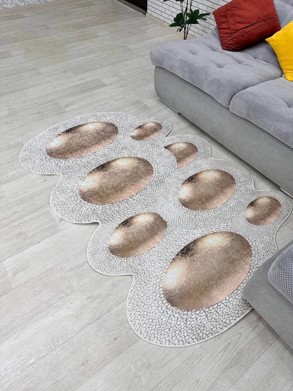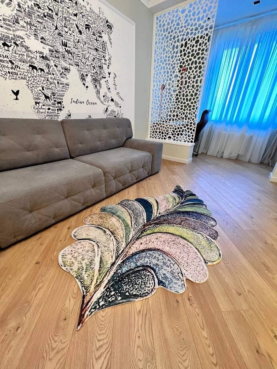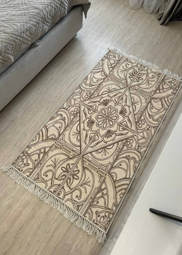 Незвичний візерунок килима, додає йому своєї особливості. З іншого боку прогумована основа з еко-шкіри, завдяки якій килим не ковзає на підлозі. М'який та приємний, на дотик ніби велюр.