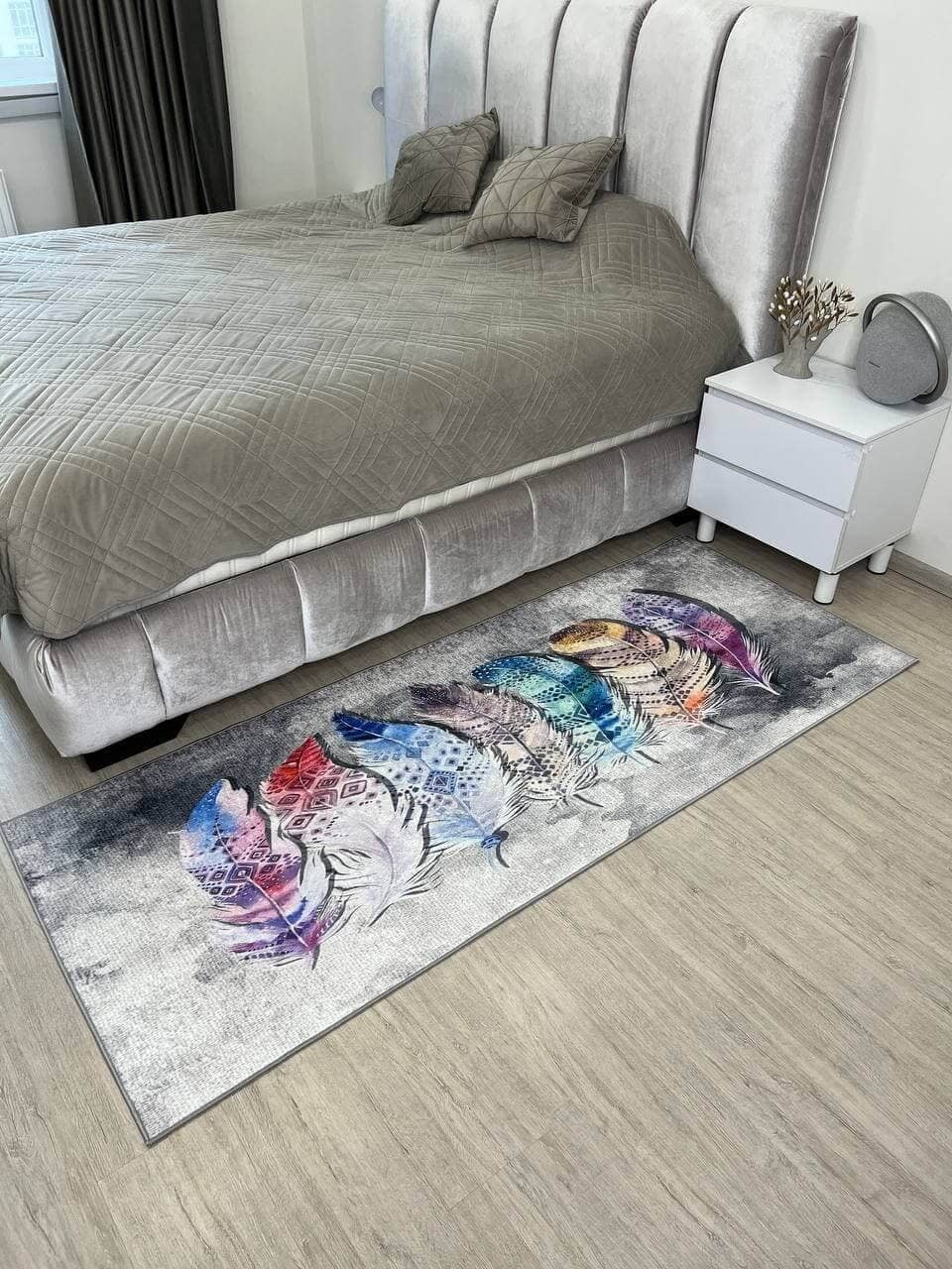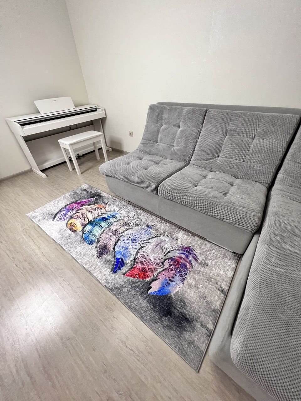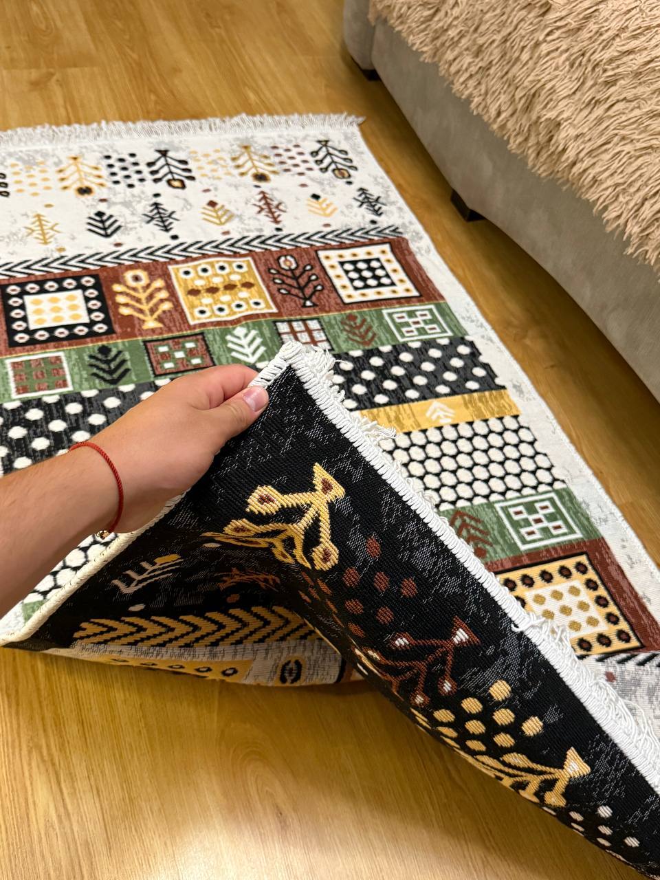 Незвичний візерунок килима, додає йому своєї особливості. З іншого боку прогумована основа з еко-шкіри, завдяки якій килим не ковзає на підлозі. М'який та приємний, на дотик ніби велюр.