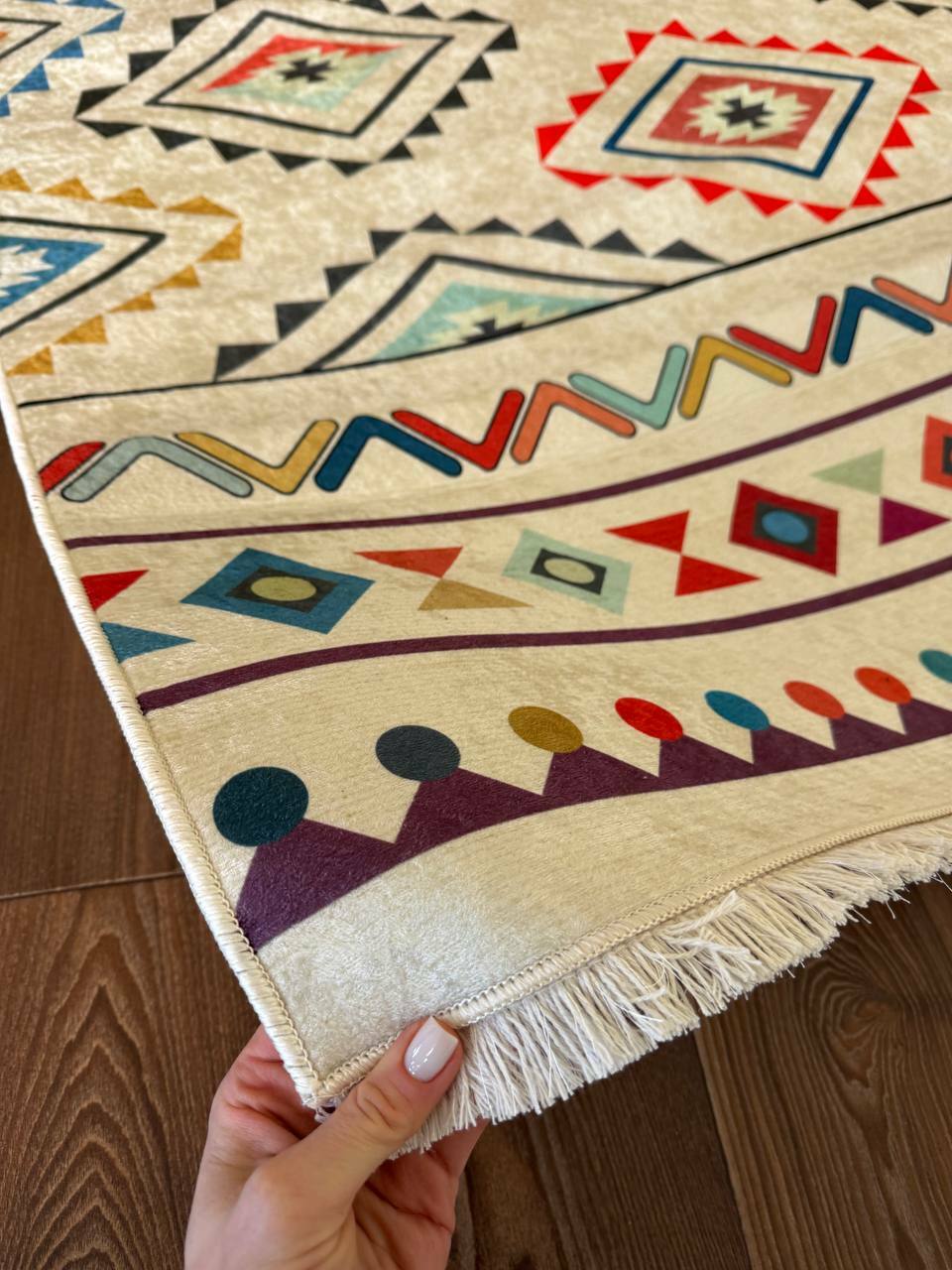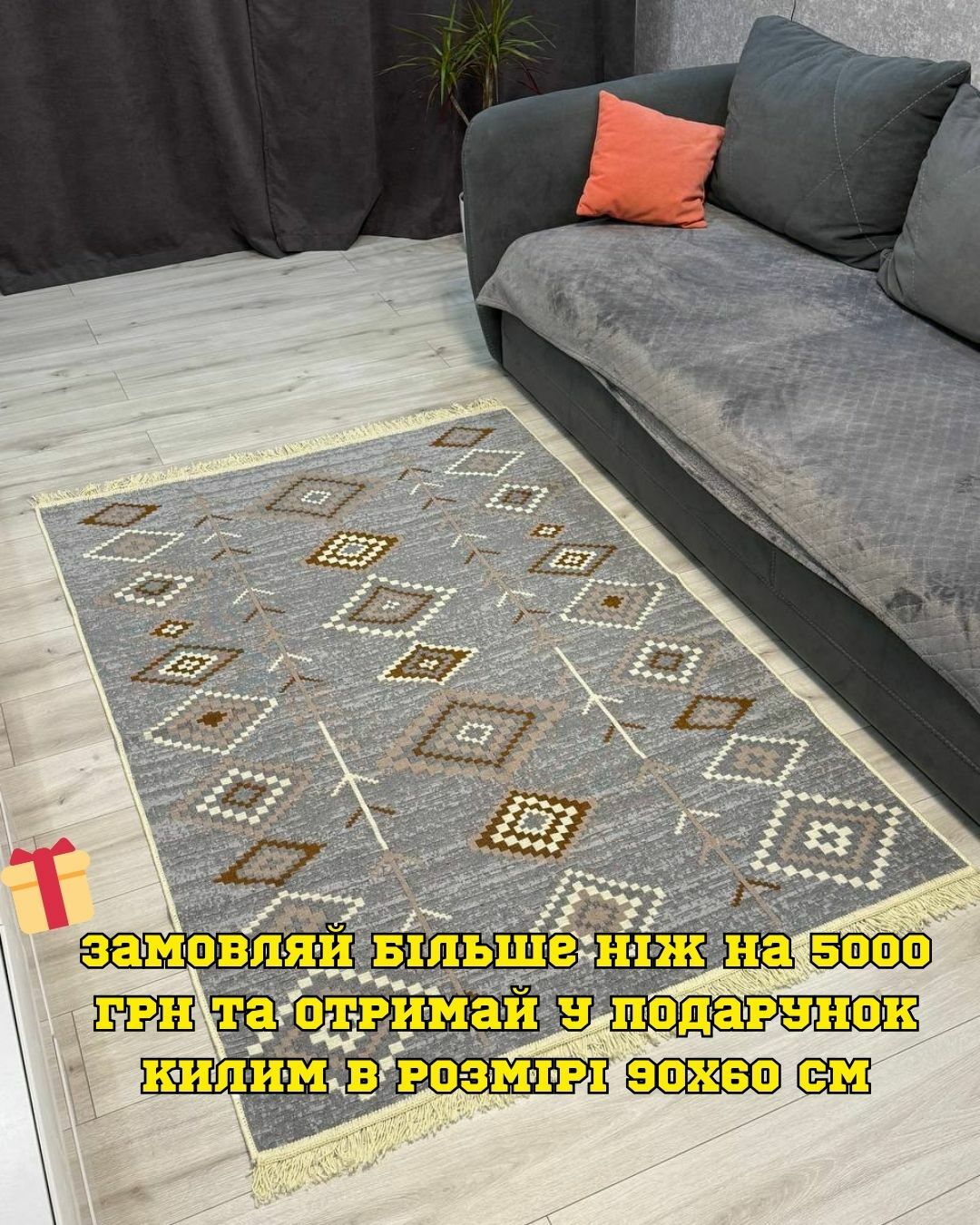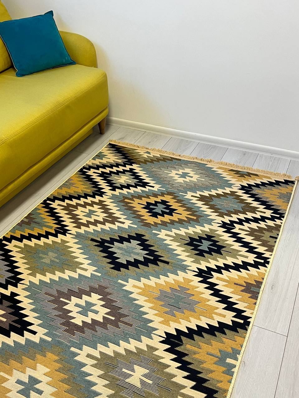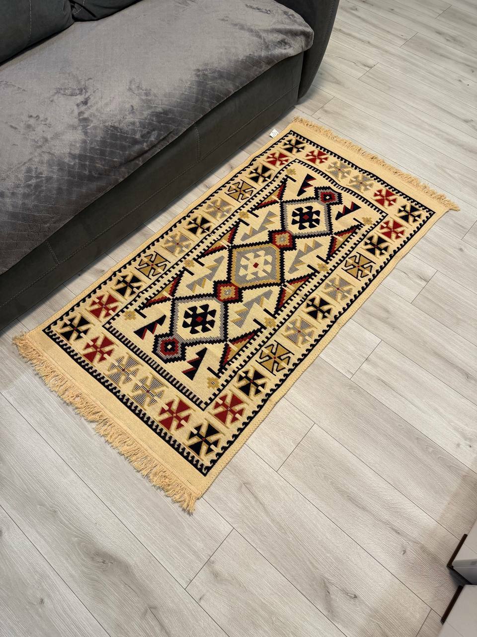 Килим з унікальним візерунком, має етнічний вигляд. Він виготовленний з 100 % бавовни та приємний на дотик. М'який та приємний, можна перевернути й у вас буде новий килим