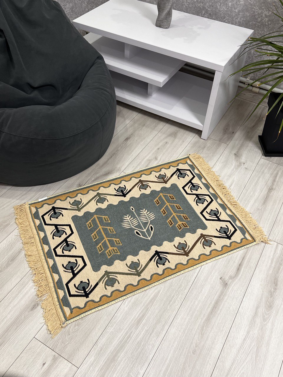 Універсальний двосторонній килим з 100% бавовни. Він приємний на дотик та має унікальний незвичний візерунок.