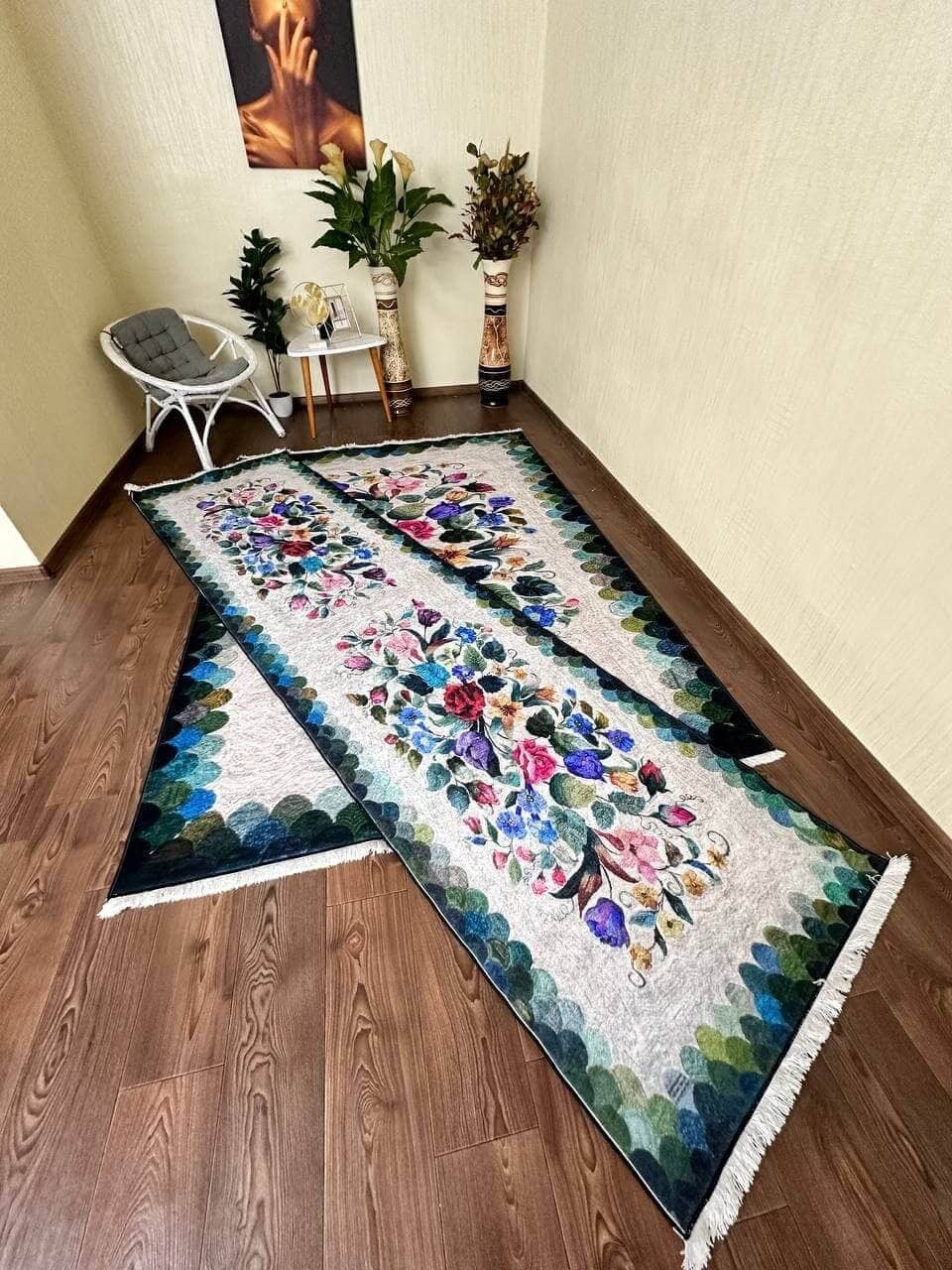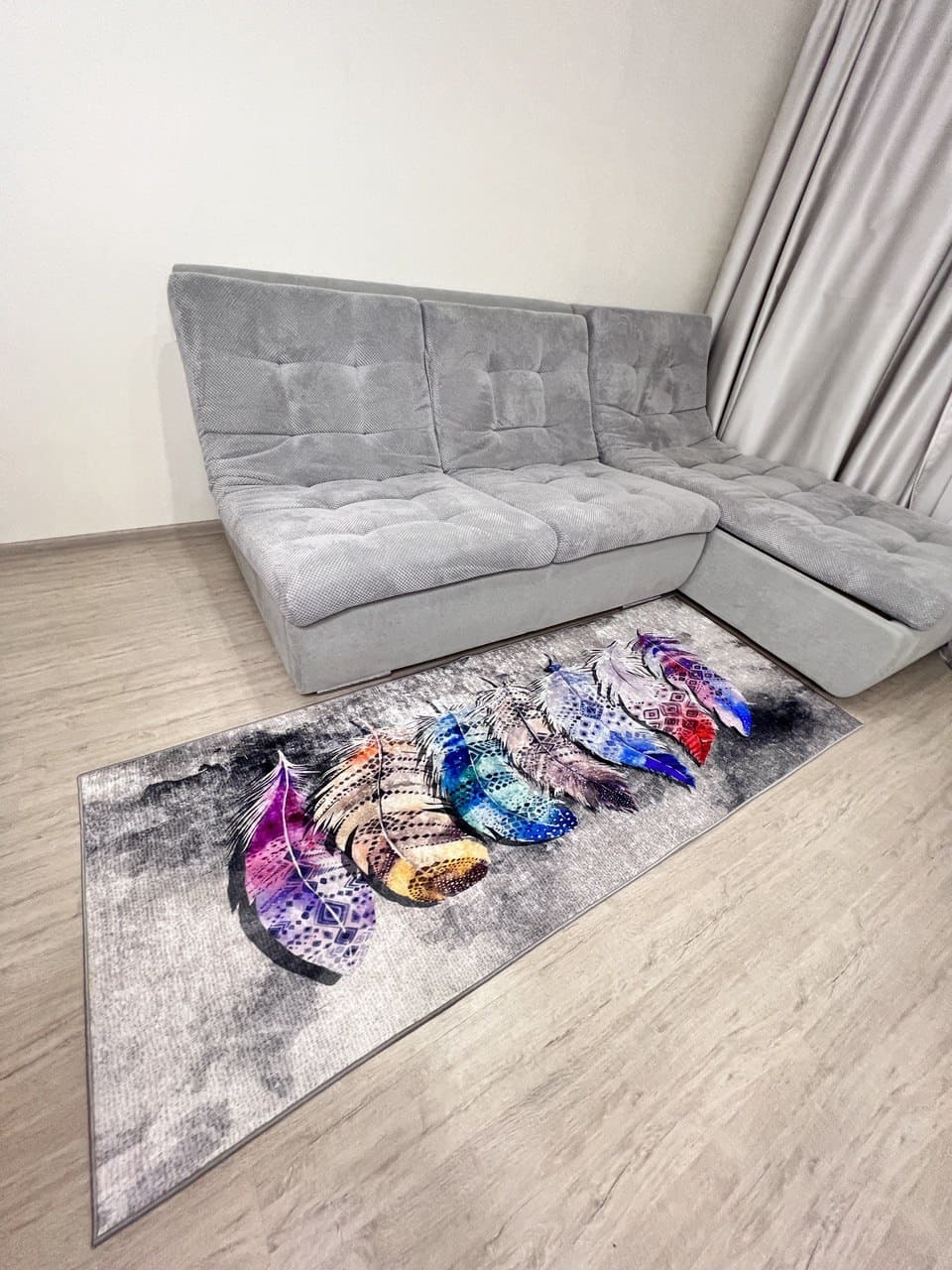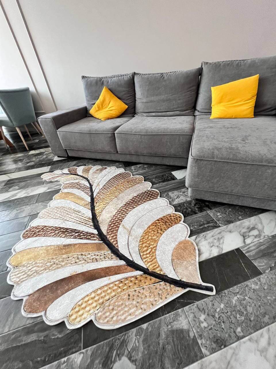 Незвичний візерунок килима, додає йому своєї особливості. З іншого боку прогумована основа з еко-шкіри, завдяки якій килим не ковзає на підлозі. М'який та приємний, на дотик ніби велюр.
