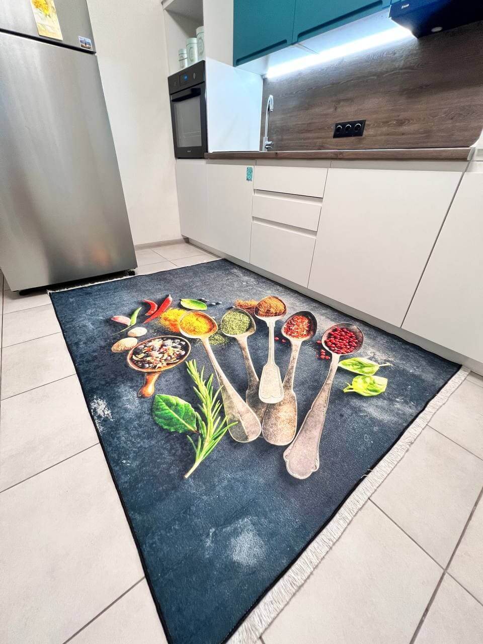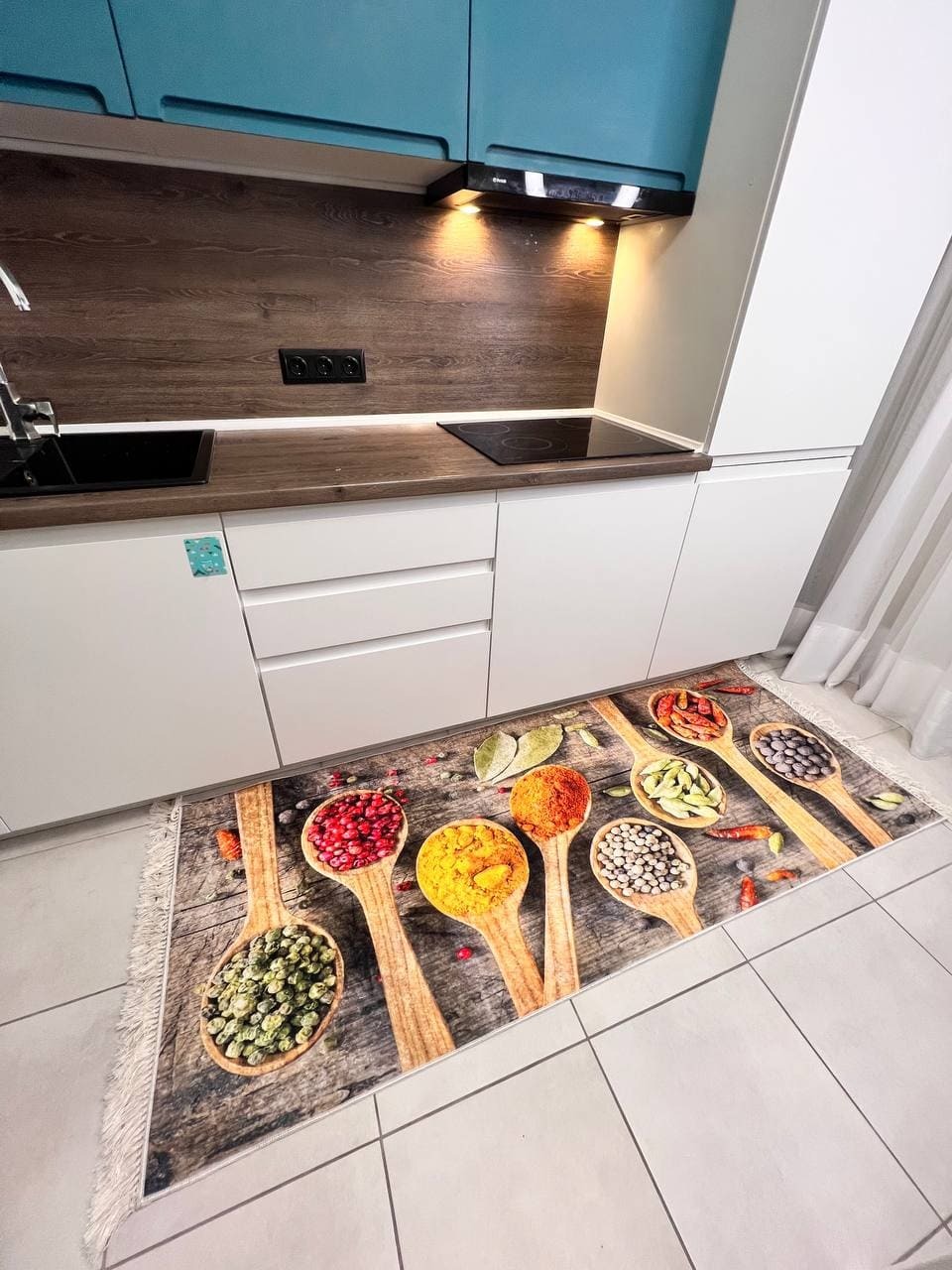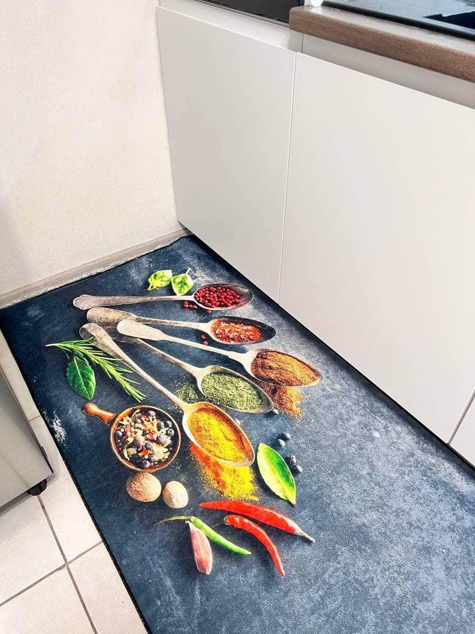 Килим на прогумованій основі, що дуже важливо для кухні. Також його можна прати в машинці за делікатного прання. Не пропускає холод, завдяки гумовій основі