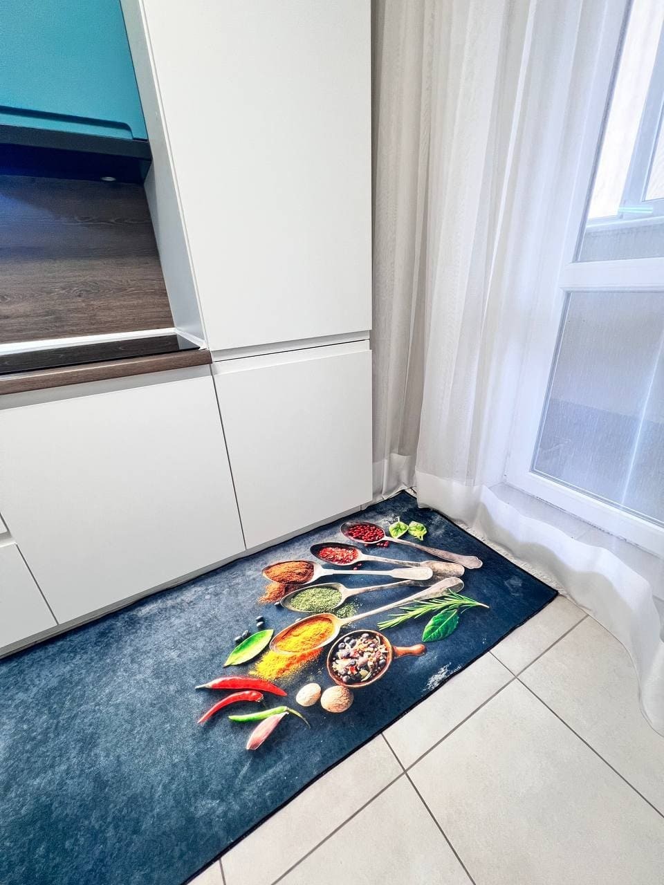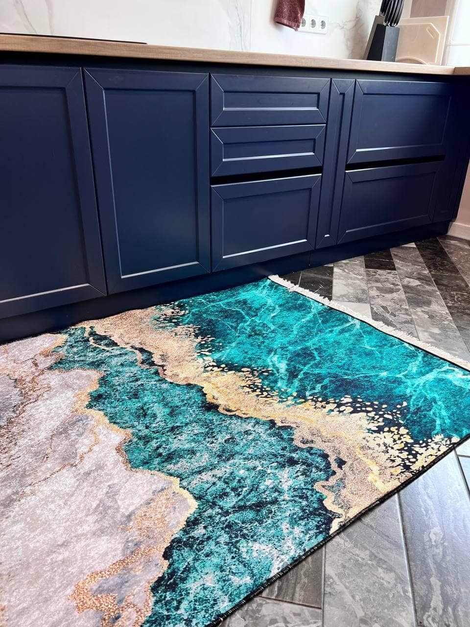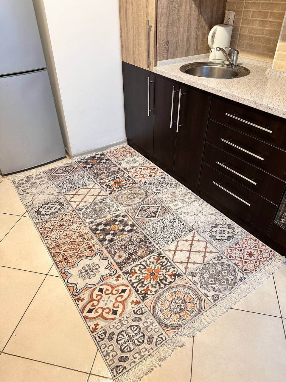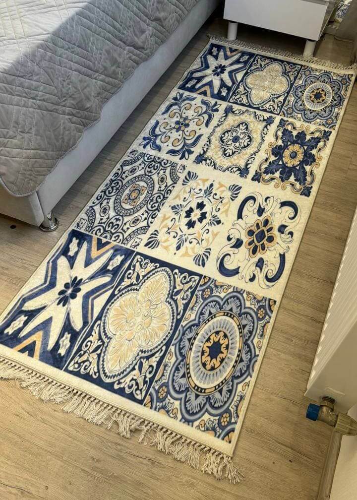 Турецький килим, високої якості незвичної форми. Підходить, як для кухні так і для коридору. Не пропускає холод та безпечний для алергиків, висота килимка 0,5 см. Не ковзають по плитці та ламінату