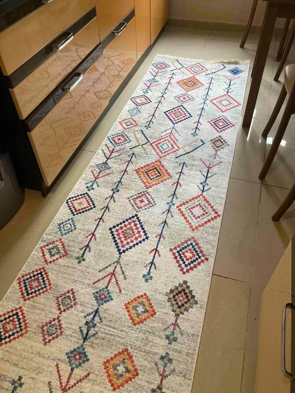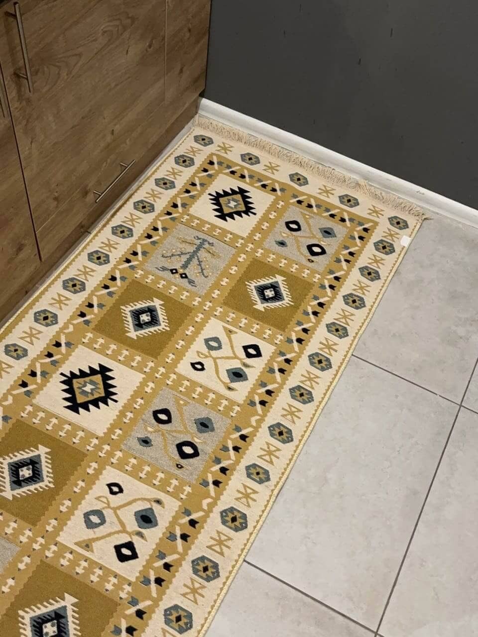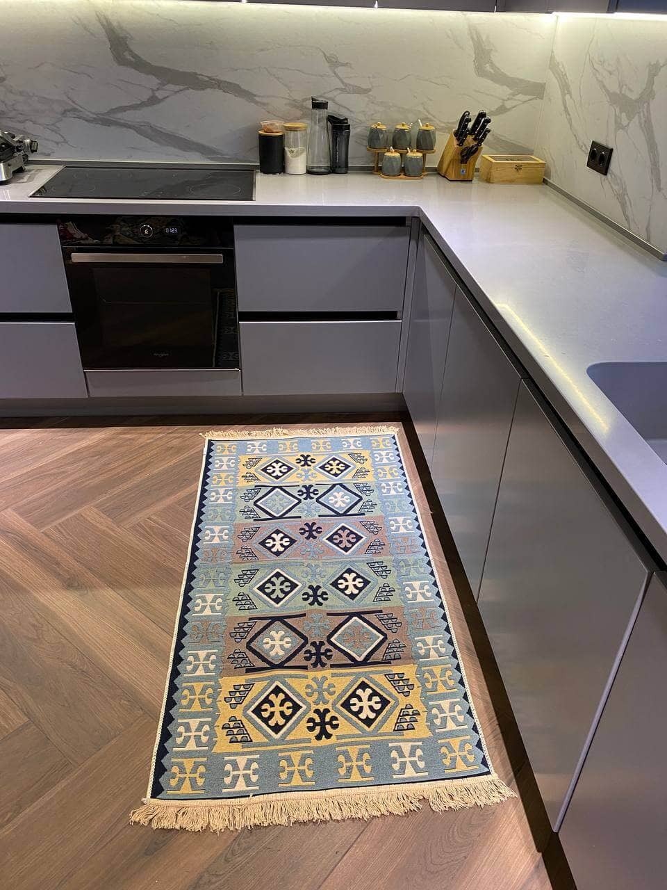 Турецький килим, високої якості незвичної форми. Підходить, як для кухні так і для коридору. Не пропускає холод та безпечний для алергиків, висота килимка 0,5 см. Не ковзають по плитці та ламінату