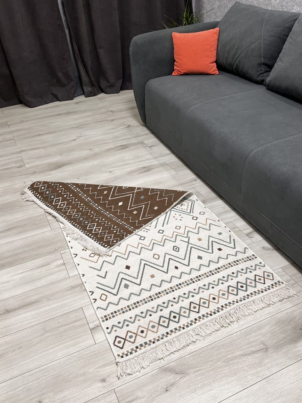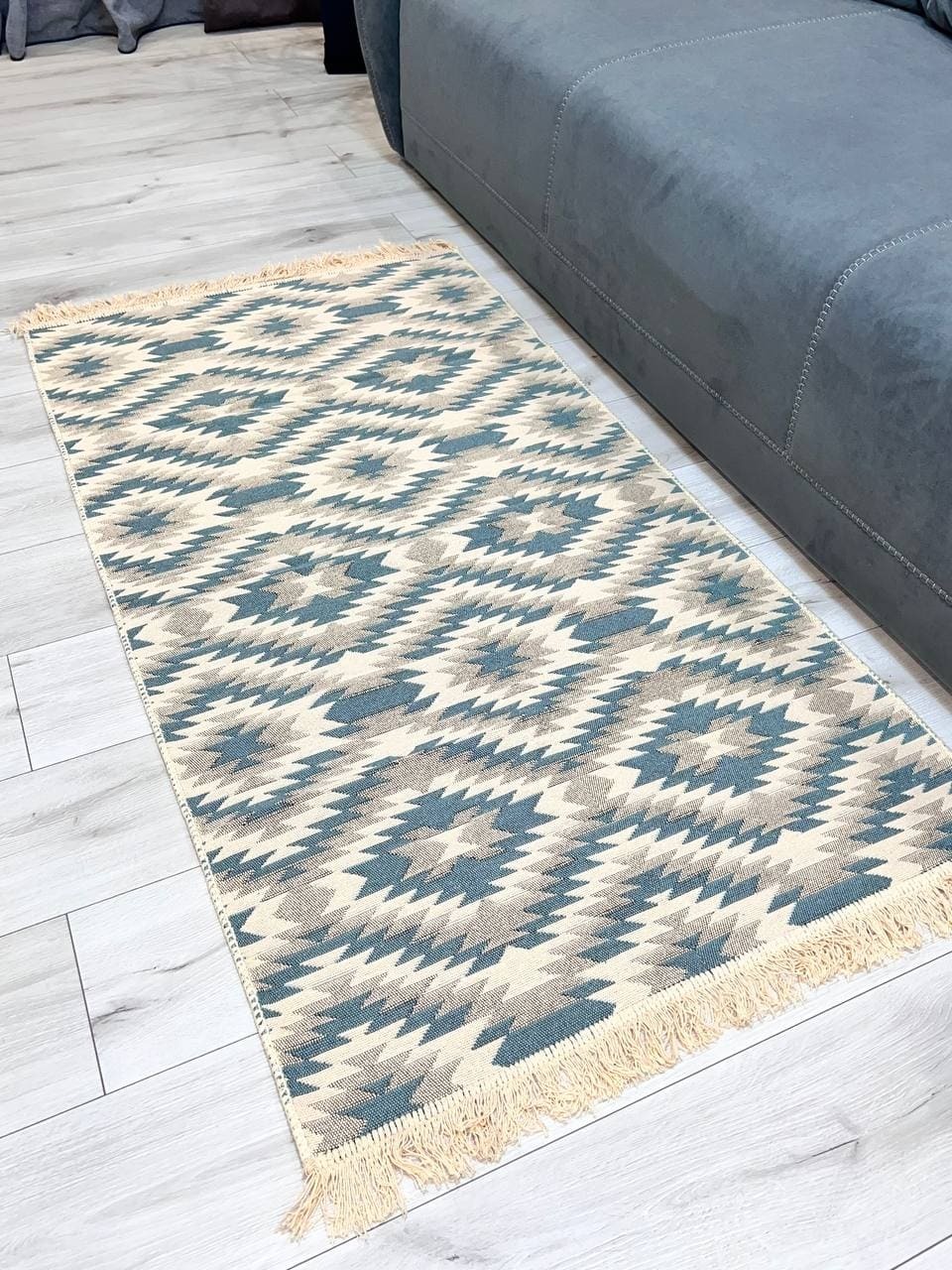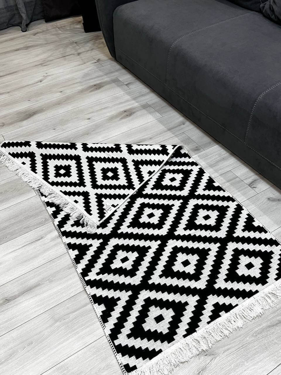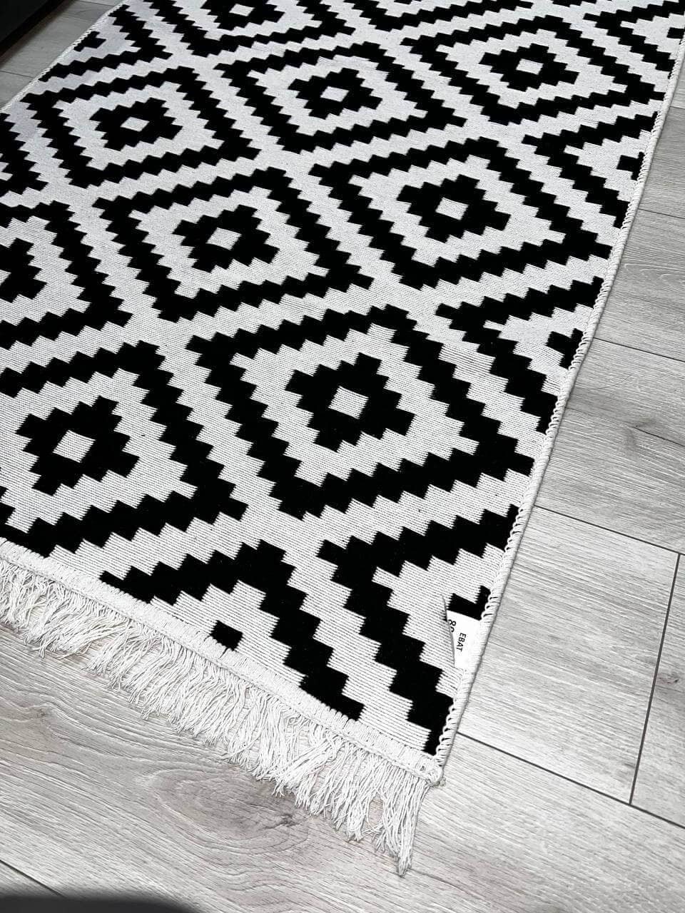 Універсальний двосторонній килим з 100% бавовни. Він приємний на дотик та має унікальний незвичний візерунок.