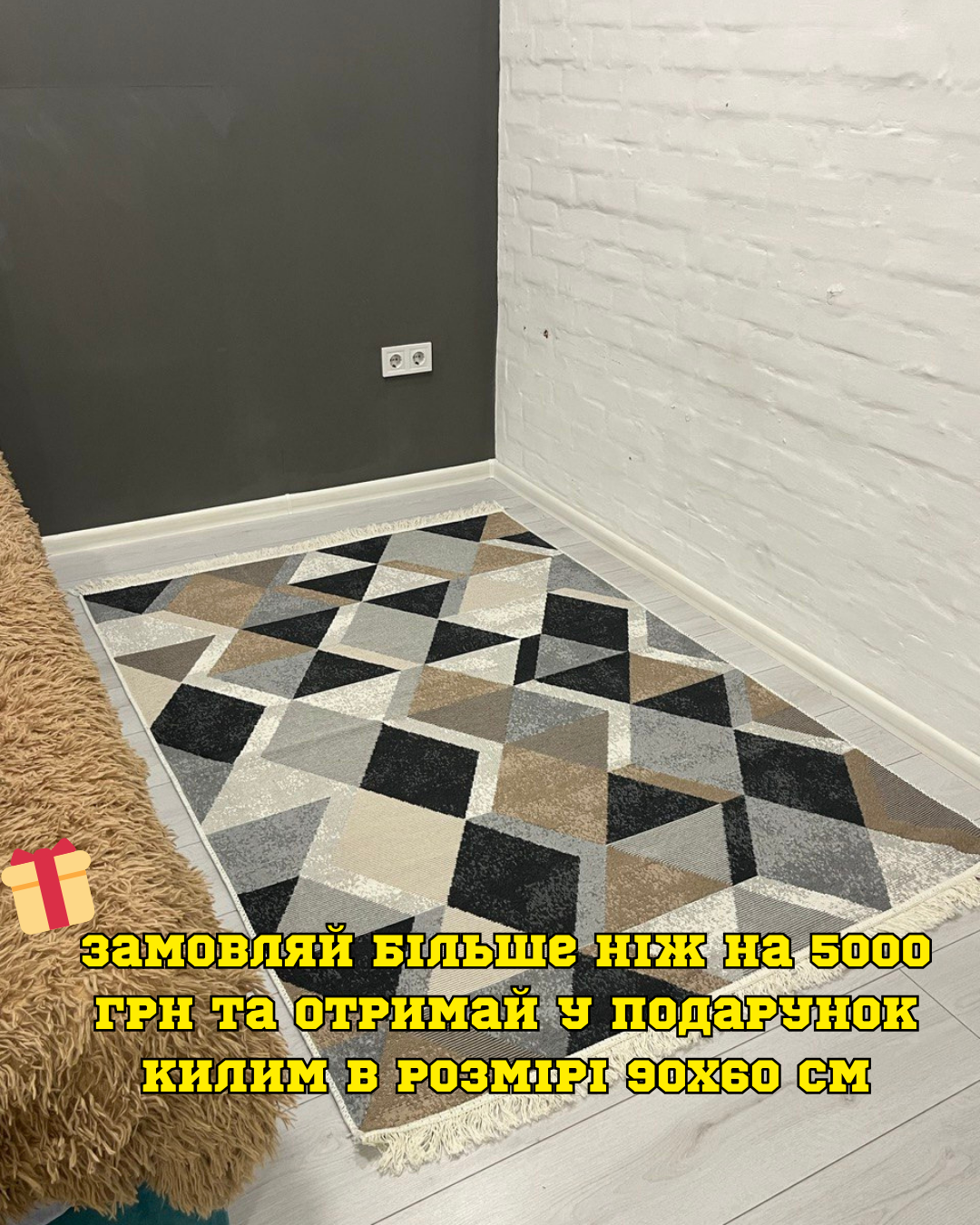 Сучасний килим. Килим є універсальним та підійде в будь яку кімнату. Прогумований екошкірою, щоб не ковзав по підлозі