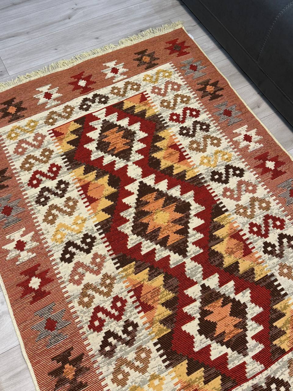 Килим виготовлений на фабриці в Туречинні, кожний узор - це окремий колір нитки. Складається з 100% бавовни, приємний на дотик, можна прати в машинці, чітко виглядає, як на фото.