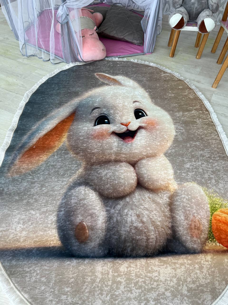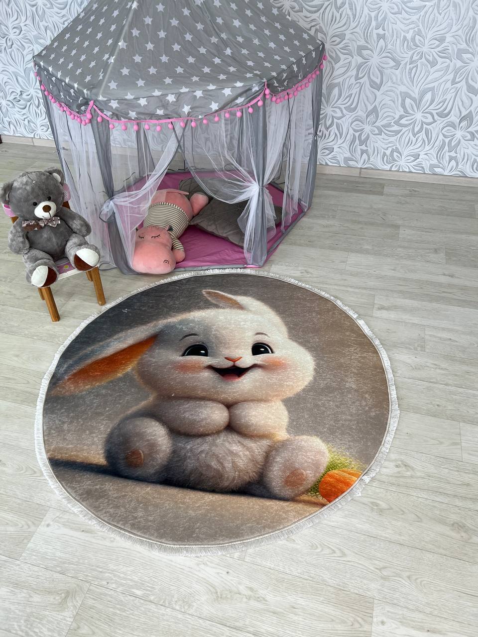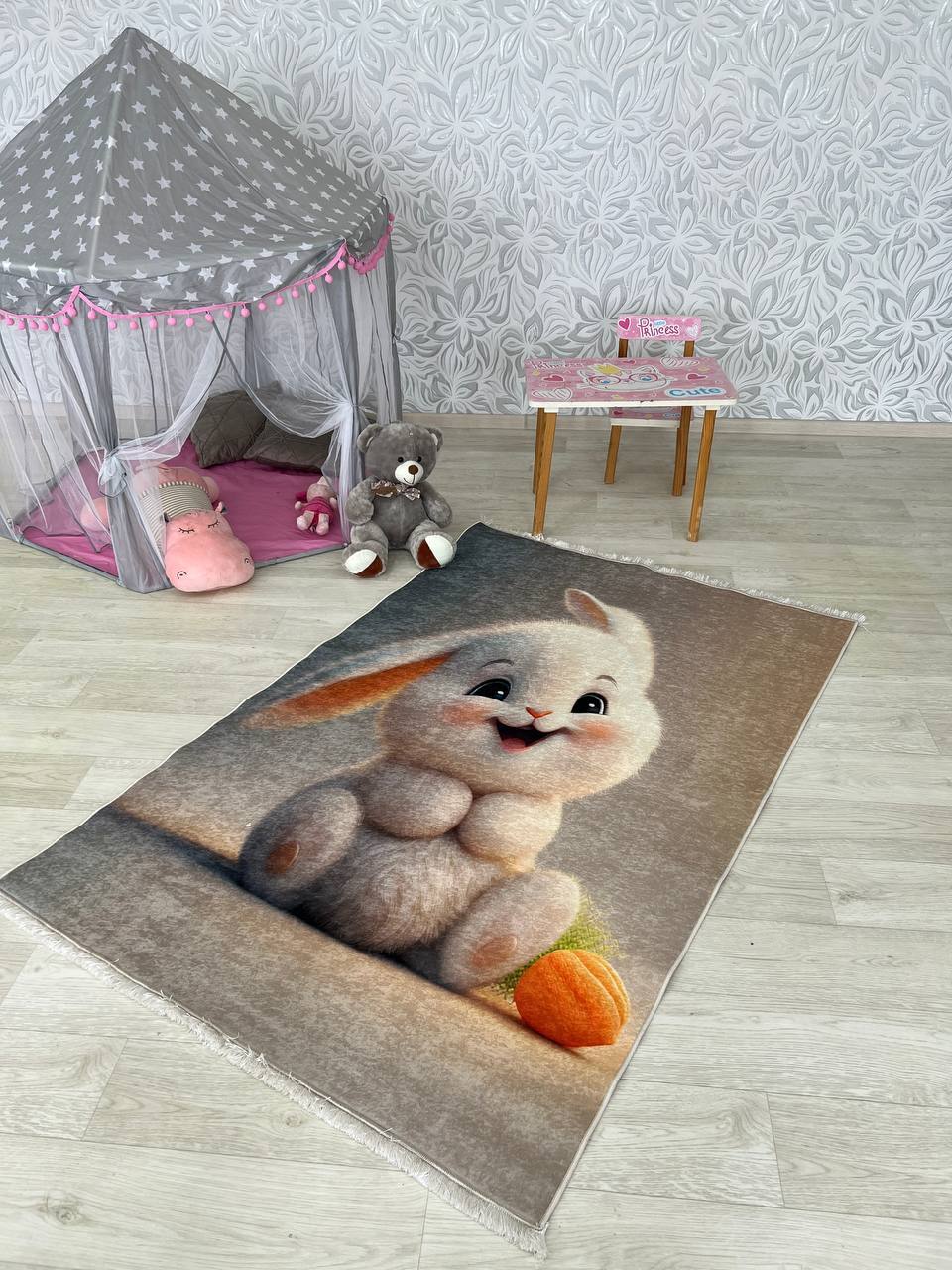 Ніжний та вишуканий дитячий килим на прогумованій основі, який не буде ковзати на підлозі, виготовлений з безпечних матеріалів, не викликає алергічних реакцій